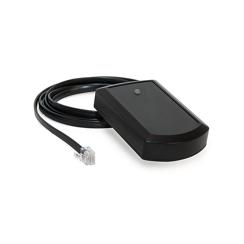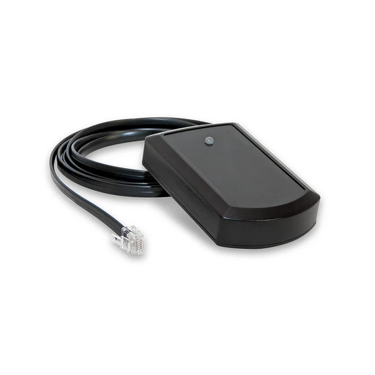 Stolní čtečka bezkontaktní médií, výstup RS232, kabel s konektorem RJ12, nutné externí napájení 12V, možnost uživatelské konfigurace formátu výstupních dat.