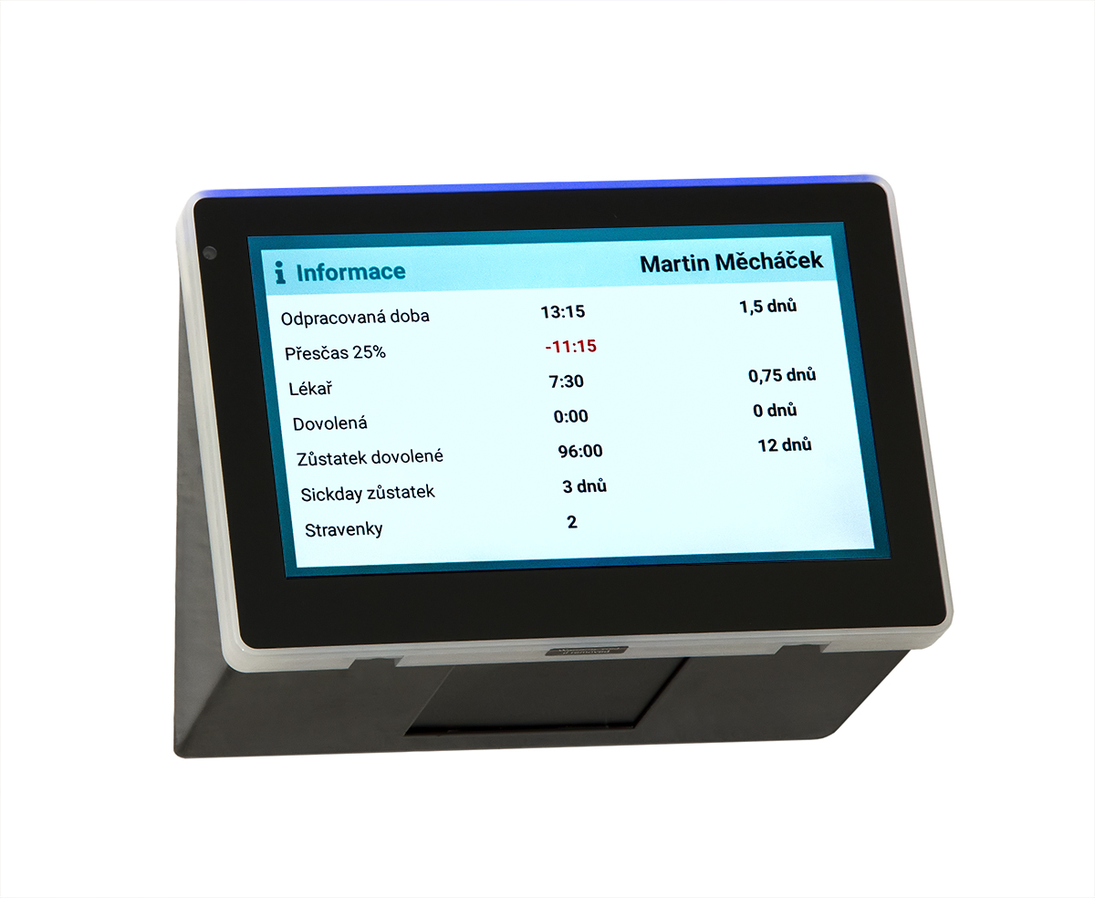 • výpis informací o odpracované době (saldo, přesčas, dovolená...)