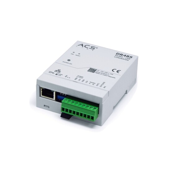 Datový převodník RS485 - LAN umožnuje připojit sběrnicové moduly ACS-line které komunikují pomocí RS485 a nemají vlastní TCP rozhraní. Na sběrnici RS485 může být současně až 32 zařízení (včetně samotného převodníku) které komunikují přes společnou IP adresu do sítě LAN. Modul obsahuje dva programovatelné vstupy a dva výstupy. Šifrovaná komunikace SSL pro bezpečné ovládání a konfiguraci.