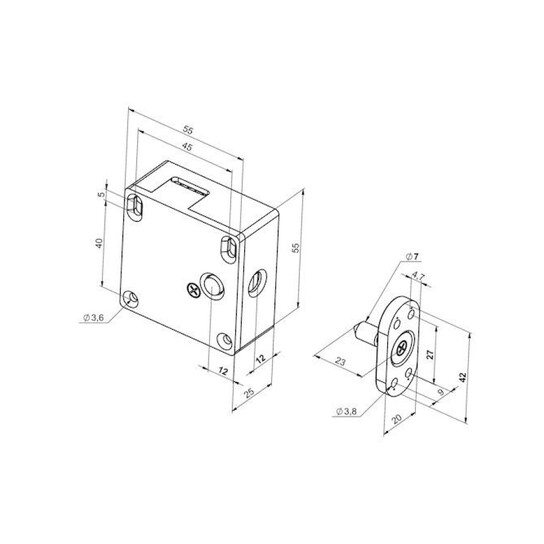 zámek skříňkový s vyhazovací pružinou a signalizací, plastové tělo 55x55x25mm